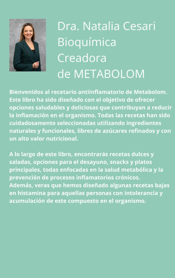 A lo largo de este libro encontrarás recetas dulces y saladas, opciones para el desayuno, snacks y platos principales, todas enfocadas en la salud metabólica y la prevenciòn de procesos inflamatorios crónicos.